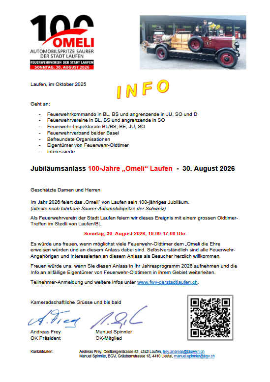 Anmeldung Feuerwehr Fahrzeuge für 30. August 2026 Anmeldungen bis 30. Juni 2026 Wir bitten Besitzer von Feuerwehrautos um Anmeldung mit dem Anmeldeformular. Die Teilnahme ist für alle Fahrzeuge gratis. Die Einfahrt für Oldtimer ins Städtchen wird von Lotsen geregelt und der Feuerwehrverein ist für das leibliche Wohl der Gäste mit Speis + Trank besorgt. |